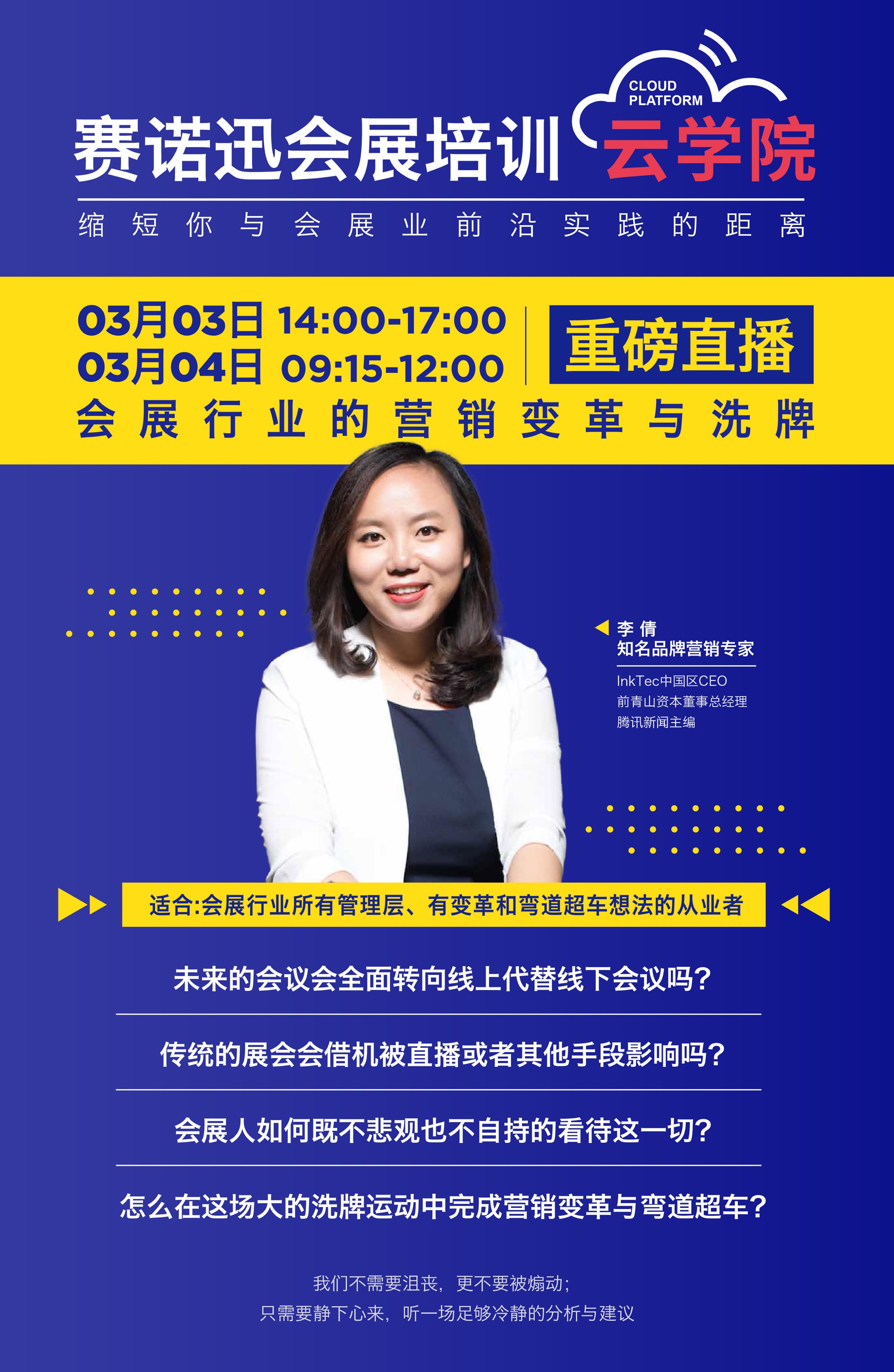 作为本场的主讲⼈,李倩老师拥有最难得的“全⾯面客观的视⻆和精准的趋势判断能⼒。她是中国最早的互联⽹网营销⼈之⼀,曾担任中国最⼤的⻔户⽹站主编。她也曾从事早期投资,从商业模式的角度对⽐了解实体和虚拟产业。如今她从事数码印刷和耗材实体产业,与传统会展行业息息相关。几次跨度极⼤的转型,让她看待今天的话题,更加敏锐客观,产生独特见解。