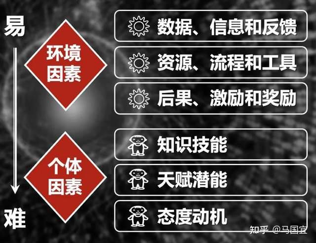这个矩阵指导的方针是:如果我们希望快速提升团队成员的绩效,先抓环境因素比先抓个体因素更事半功倍。