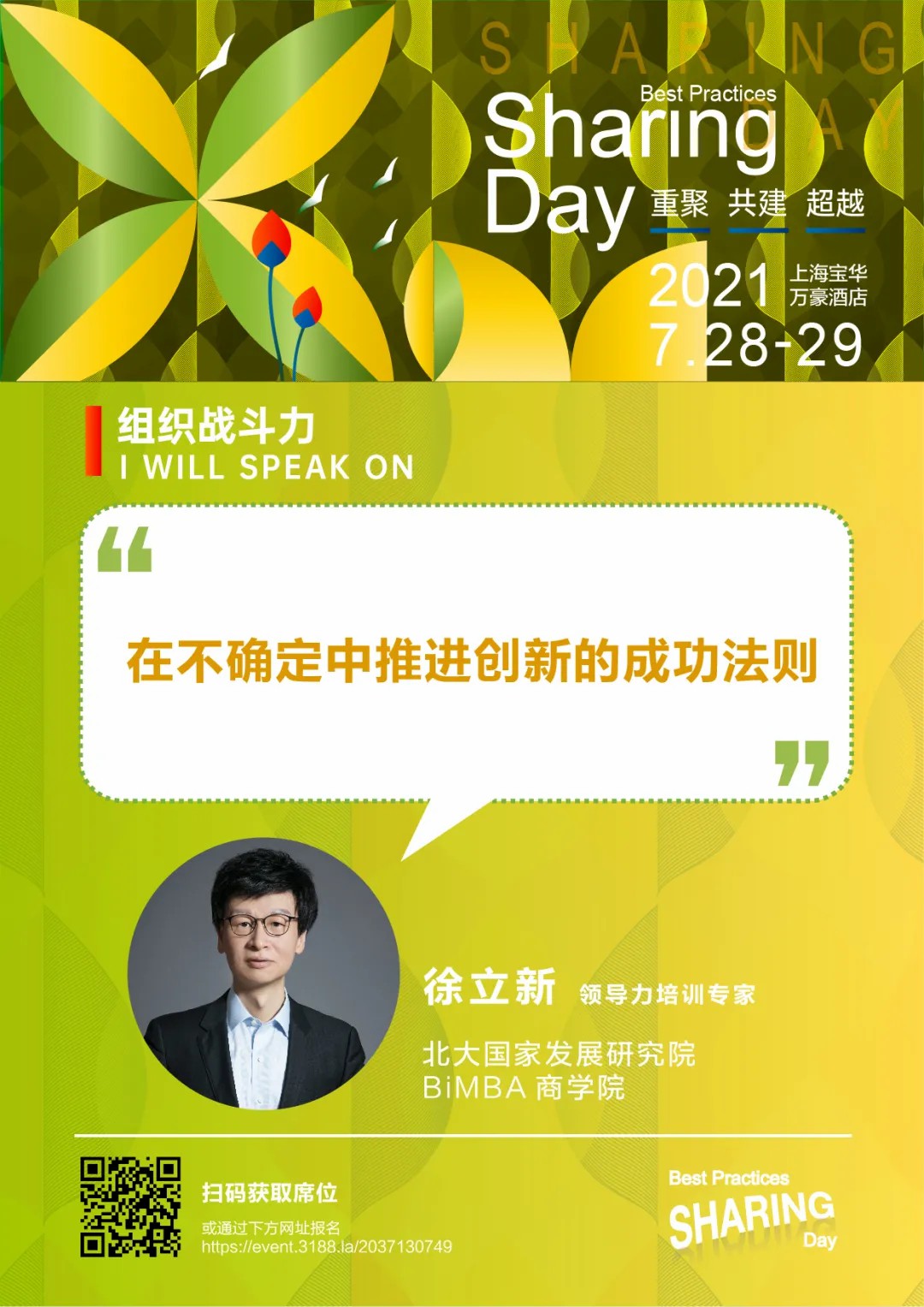 徐立新老师是北大国家发展研究院BIMBA商学院的领导力老师,为阿里巴巴、百度、可口可乐、融创地产、国家开发银行在领导力塑造、企业文化落地等方面提供培训。在过去的两年中,他为上海百文、北京雅森、中联慕尼、机电商会等众多会展团队的管理者提供了领导力方面的培训辅导。除了海报中提到的他在本届交流日的这场主题演讲,他还会在7月29日这天开放几个咨询时段。