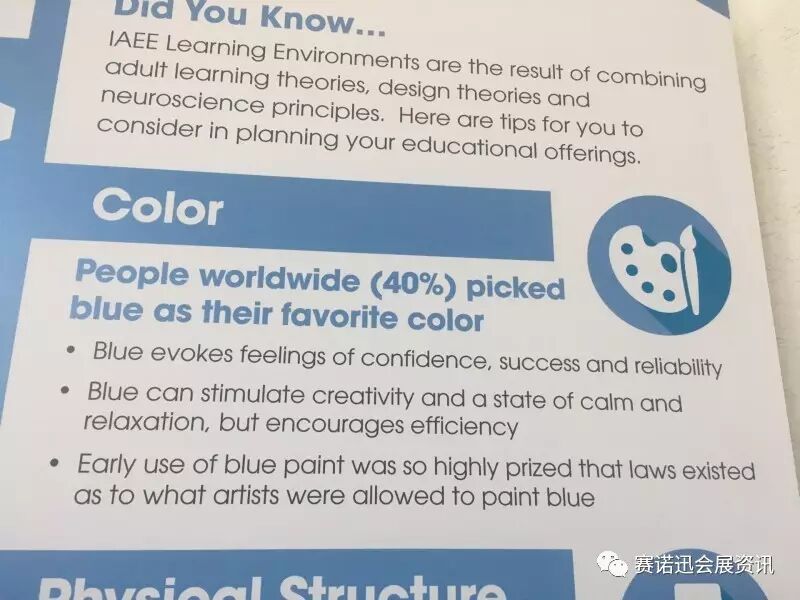 我在IAEE(国际展览及活动业协会)年会曾看到主办方团队非常深入的举措。下图出现的位置是在IAEE年会多个分会场的门外,解释的是色彩对于人脑及人体感受的影响,信息中还有这样的文字“软的座椅会让人更愿意呆的更久一些”。