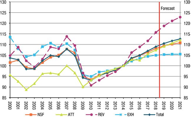 CEIR经济学家艾伦·肖博士指出,他是全球经济咨询协会的首席经济学家。CEIR预计,总体指数增速将放缓至1.4%,比2018年的增速低0.5个百分点,比实际GDP增速落后1.0个百分点。随着经济步入缓慢可持续增长的轨道,2020年和2021年的展览表现将进一步平稳放缓增长至1.1%和0.8%。(参见图2)