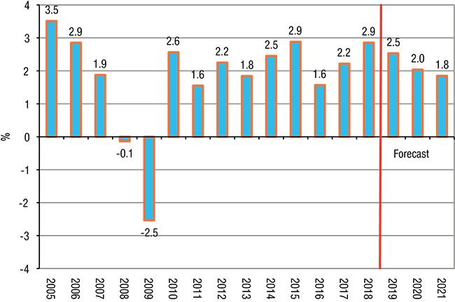 2018年,美国经济增长提速,从2017年的2.2%增长到2018年的2.9%,连续第8年实现增长。非住宅投资引领经济发展,个人消费和联邦国防支出提供了支持。贸易逆差的扩大部分的抵消了GDP增长。未来几年GDP增长将由个人消费支出和私人投资支出的平稳增长推动;二者更高的支出水平都得益于最近的减税,政府开支的适度增长将提供额外的刺激。尽管如此,随着减税的影响减弱,个人和企业支出增长将放缓,不断扩大的贸易逆差将限制潜在的整体扩张。根据CEIR目前的预测,实际GDP增长将在2019年回落至2.5%左右,然后在2020年和2021年进一步减速至2.0%和1.8%(见图1)。